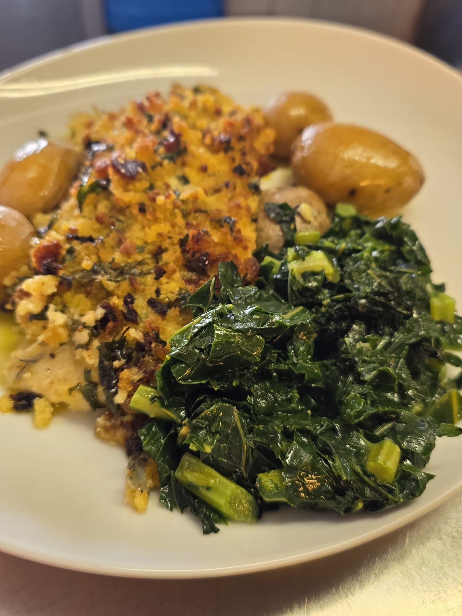 Posta de bacalhau grelhada regada com azeite e alho acompanhado de batata e legumes